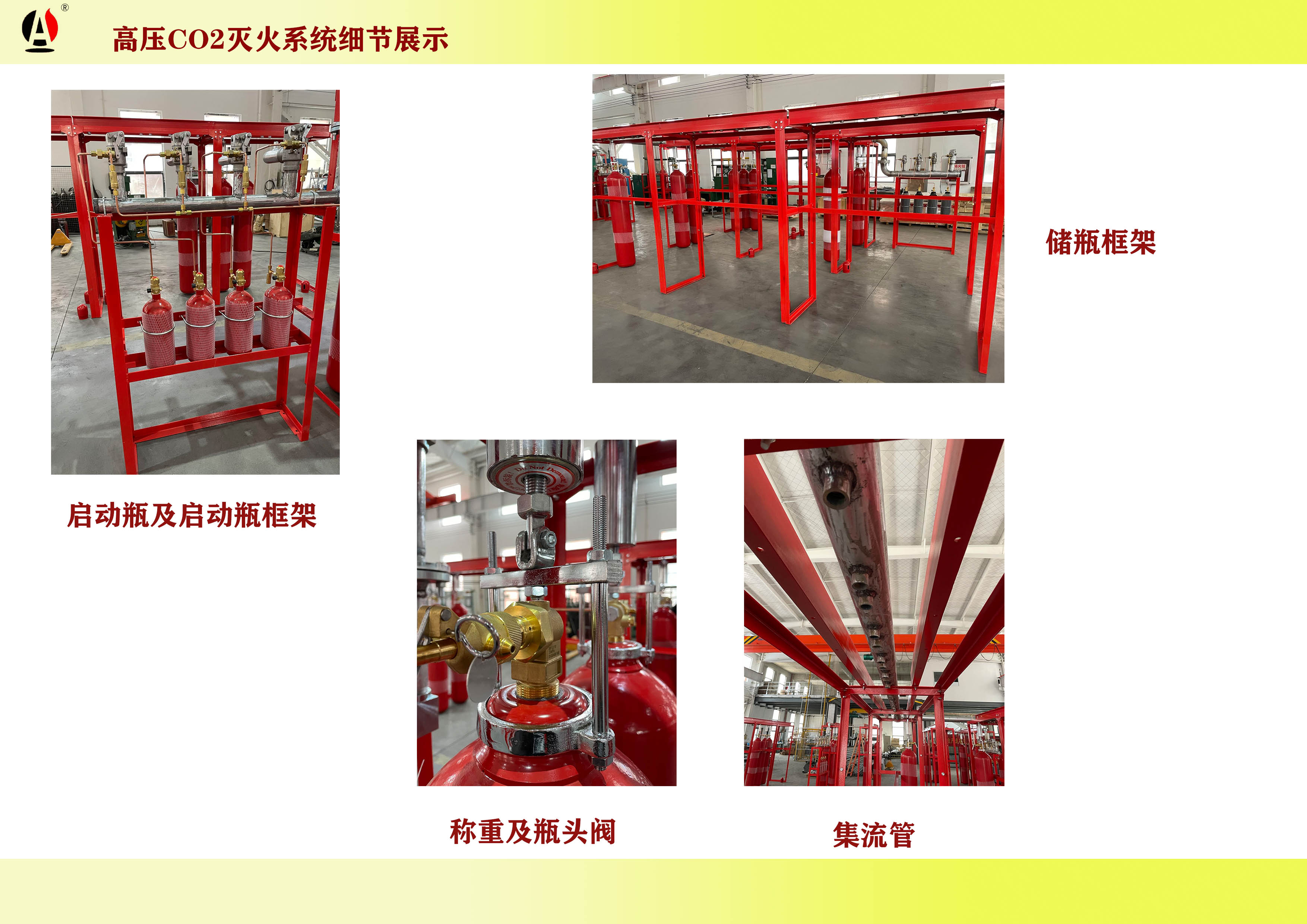 二氧化碳滅火系統(tǒng)由滅火劑儲(chǔ)存瓶組、稱重裝置、液體單向閥、連接管、集流管、安全閥、壓力信號(hào)器、驅(qū)動(dòng)氣體儲(chǔ)存瓶組、氣體單向閥、選擇閥、管網(wǎng)、噴頭及自動(dòng)滅火控制器等部件組成。
